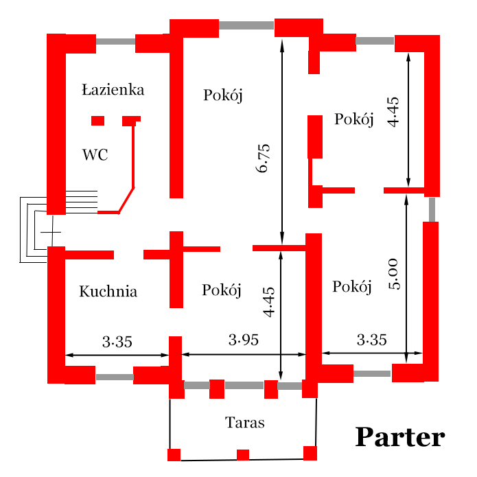 Szczegółowy wykaz pomieszczeń i ich wymiary podane są na szkicu. Dach kryty blachą, budynek posiada wszystkie media prócz miejskiej kanalizacji, która przebiega w ulicy. Zdecydowanie wymaga kapitalnego remontu.